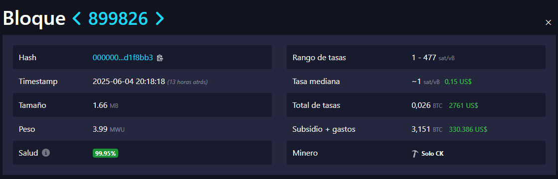 Un minero solitario procesó el bloque 899.826 de Bitcoin, consiguiendo una recompensa total de 3,151 BTC, equivalentes a más de 330.000 dólares. El bloque fue encontrado el 4 de junio a través de la plataforma Solo CKPool, un servicio que permite a los mineros intentar resolver bloques de manera individual.