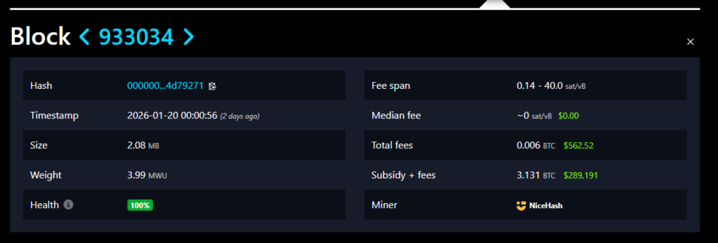 Por otro lado, el pasado 14 de enero, CriptoNoticias detectó otro bloque minado en solitario con la marca de NiceHash en el registro. Sin embargo, a diferencia del bloque 933034, ese evento no fue confirmado oficialmente por la empresa.