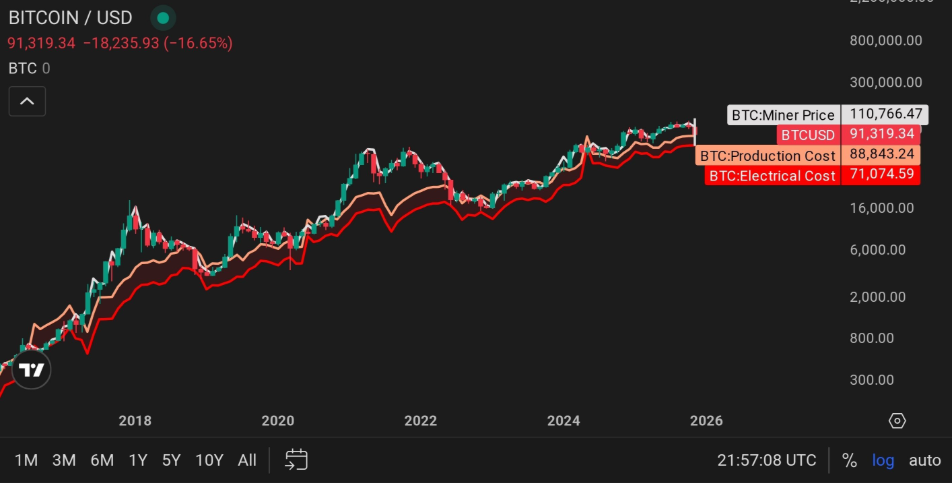 La línea del costo de electricidad, históricamente, ha actuado como un piso dinámico crucial para el precio de BTC.