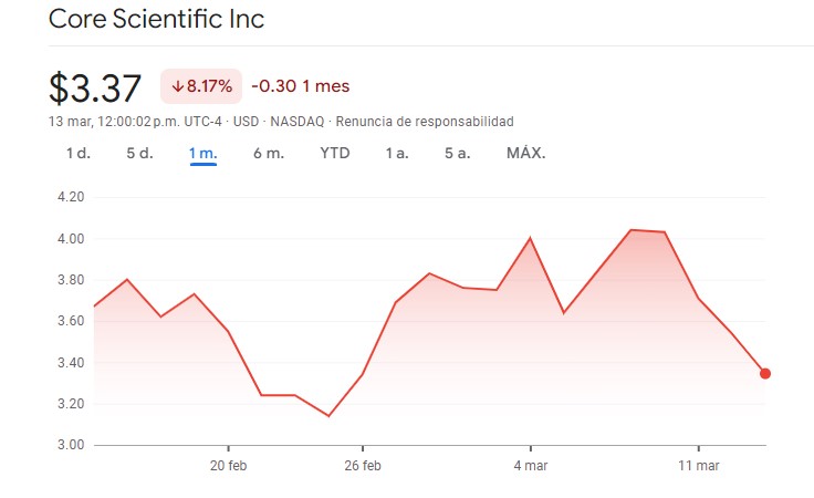 La acciรณn de Core Scienfic (CORZ) llegรณ a cotizarse en USD 4 en las รบltimas dos semanas. Sin embargo, sufriรณ una caรญda de valor de hasta 8% en las รบltimas horas, hasta alcanzar la marza de USD 3,37 por acciรณn.