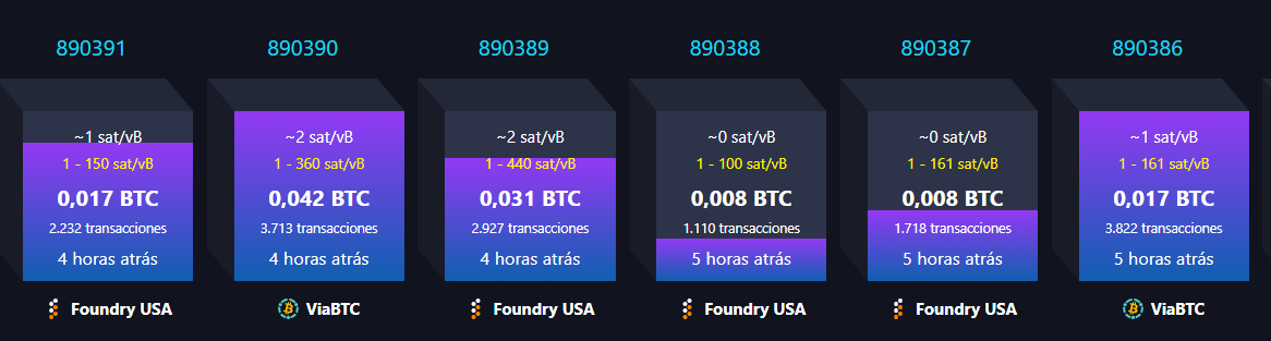 Ciertos bloques, entre muchos otros, identificados a la altura de 890410, 890402 u 890388, según datos actuales de la mempool, muestran una actividad mínima en la red de Bitcoin.