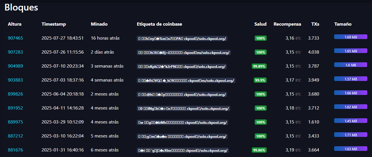Durante 2025, nueve bloques fueron encontrados por participantes de Solo CKpool.