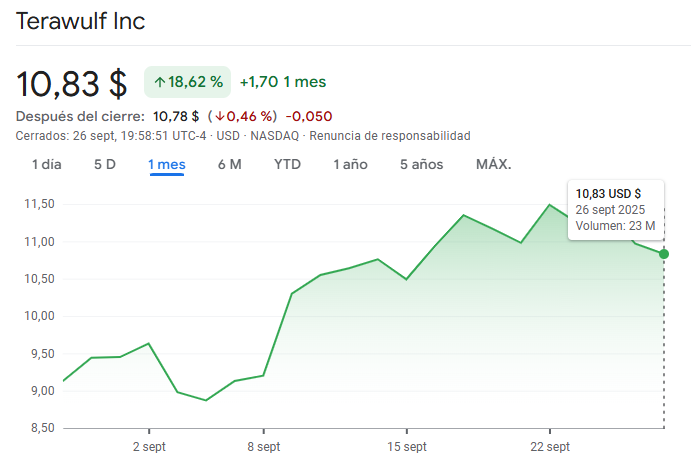 Actualmente, WULF se mantiene al alza cotizando en 10,83 dólares por acción, según Google Finance.