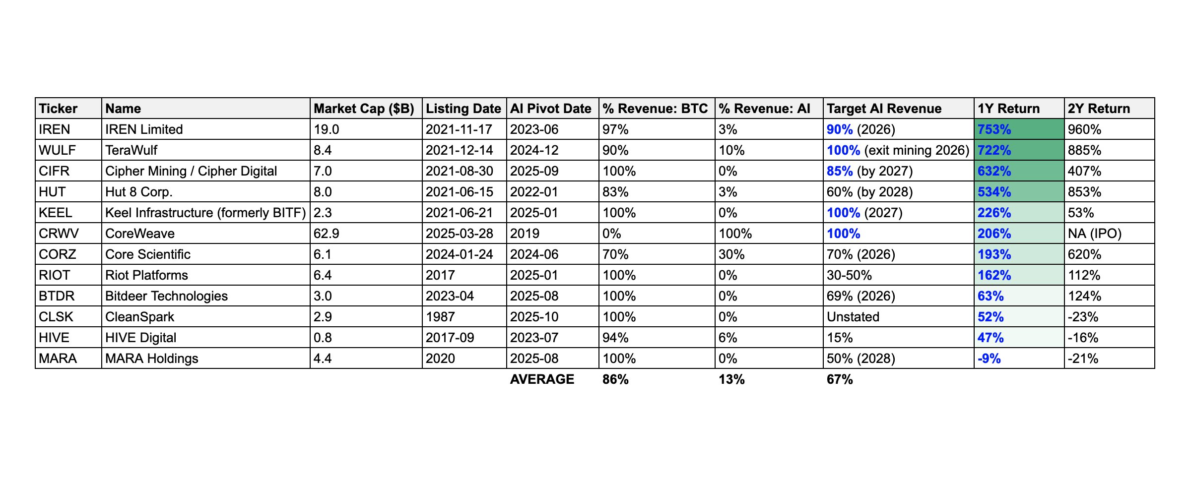 El anรกlisis, publicado en X este 16 de abril y basado en declaraciones directas de las propias empresas, proyecta que los ingresos provenientes de la minerรญa de Bitcoin podrรญan caer del 90% al 30% del total de sus operaciones. Edwards identifica un patrรณn bursรกtil que respalda la tendencia: las mineras que apuntan a que mรกs del 80% de sus ingresos vengan de la IA registraron alzas de sus acciones superiores al 500% en promedio, mientras que las que mantienen menos del 60% en IA vieron apenas una dรฉcima parte de ese crecimiento, con varias en terreno negativo a dos aรฑos.