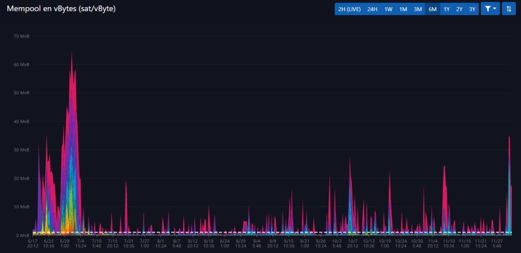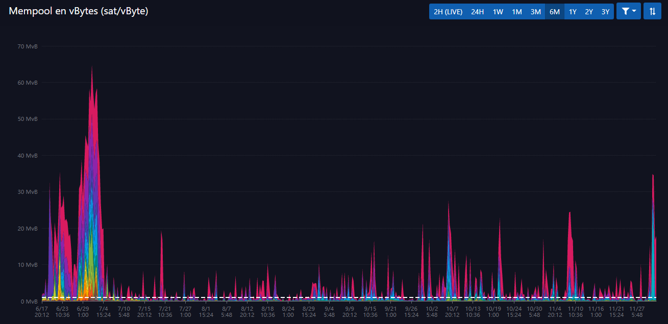 En los últimos días hemos observado el aumento del volumen de transacciones en espera en la mempool de Bitcoin, y por tanto el incremento de las comisiones promedio, según Mempool.Space.
