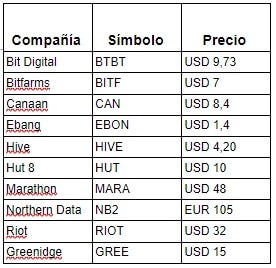 Marathon descendió de los USD 54 a USD 48; Hut 8 desde los USD 15 a los USD 10; Canaan desde los USD 9,7, a los USD 8,44; Riot Blockchain desde los USD 36 a los USD 32, y así con todos los de nuestra lista.