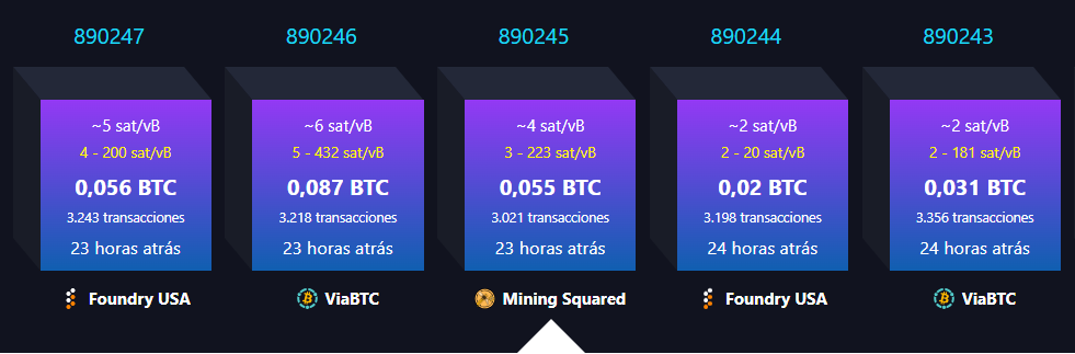Los datos del bloque 890245 indican que tuvo una recompensa de 3,125 BTC, con un total de 3.021 transacciones procesadas y un peso de 3.99 MB. Asimismo, el pool de minería que procesó el bloque recibió una recompensa de 0,055 BTC o USD 4.510 por concepto de tarifas.
