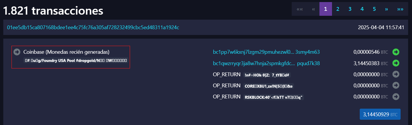 Warren asegura que se pueden observar similitudes en pagos del pool, tamaño del bloque, organización de las transacciones, tiempo de distribución e incluso errores en el código para identificar la fuente real de una plantilla, y no solo en la atribución OP_RETURN en la transacción de coinbase, que tiene el siguiente formato: “Mined by Foundry USA». Este es el método que, asume Warren, utiliza Mempool.space para determinar de qué pools provienen las plantillas.
