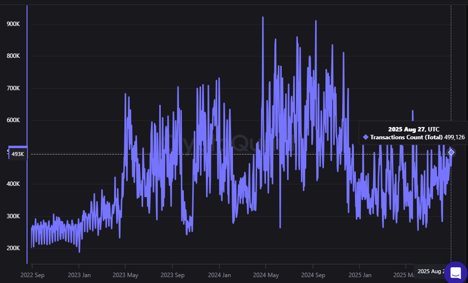 De acuerdo con datos de CryptoQuant, al 27 de agosto había unas 940.000 cuentas activas en la red. La cifra representa una reducción del 27% frente a noviembre de 2024, cuando casi 1,3 millones de direcciones tuvieron actividad en un mismo día.
