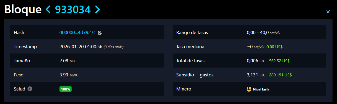 Allí, cada vez que un minero procesa un bloque, se lleva la recompensa completa: 3,125 BTC por subsidio de bloque, más las comisiones de las transacciones.