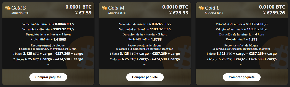 Un ejemplo es el paquete de 8,96 dólares, que otorga una potencia de 2,36 PH/s (0,00236 EH/s) durante un lapso de 2 horas con una probabilidad estimada de éxito de casi 0,0028%, según la plataforma.