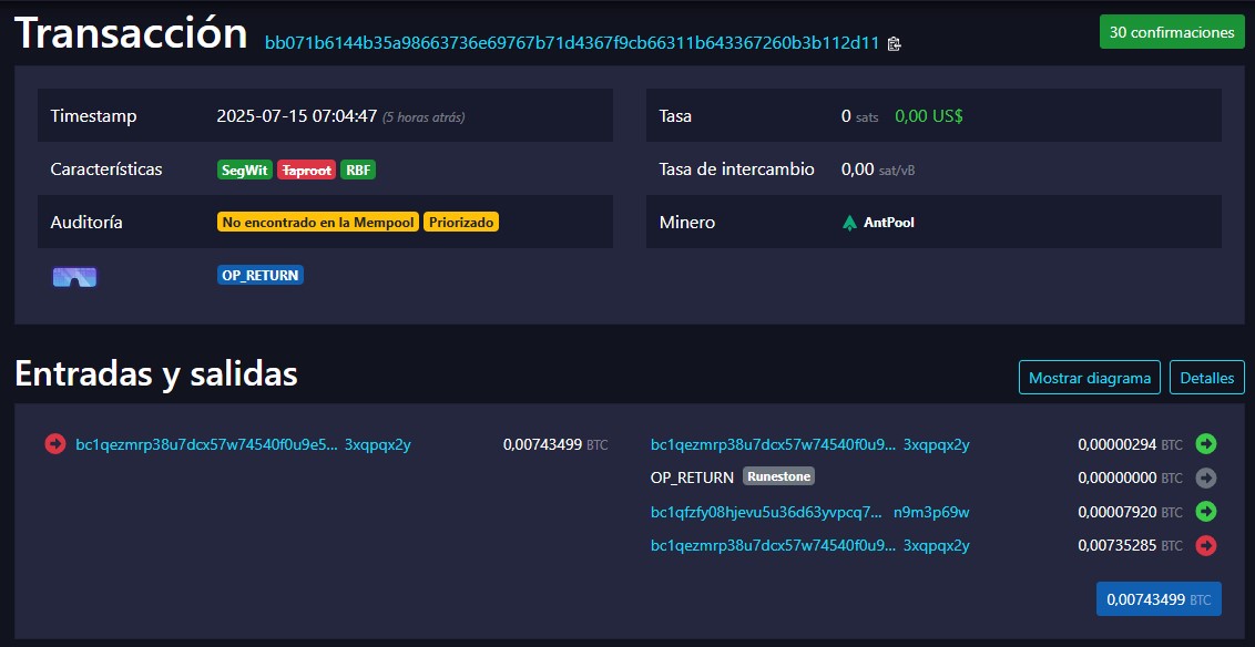 Un ejemplo concreto fue lo hecho por el pool AntPool (no mencionado por Mononaut), que en el bloque 905665 minรณ dos transacciones con una tasa de intercambio de 0,00 sat/vB, ambas incluyendo inscripciones del protocolo Runes y sin costo alguno.