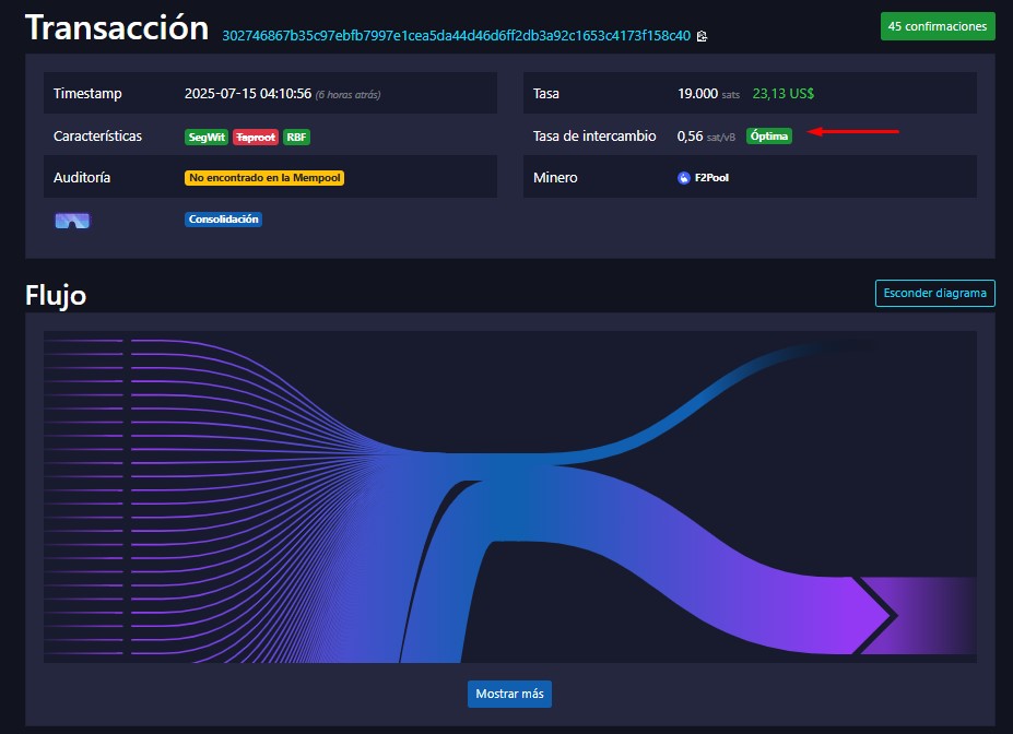 Otro caso es el de F2Pool, que en el bloque 905649 incluyรณ una transacciรณn con una tasa de 0,56 sat/vB, aunque en este caso no se aรฑadieron inscripciones OP_RETURN.