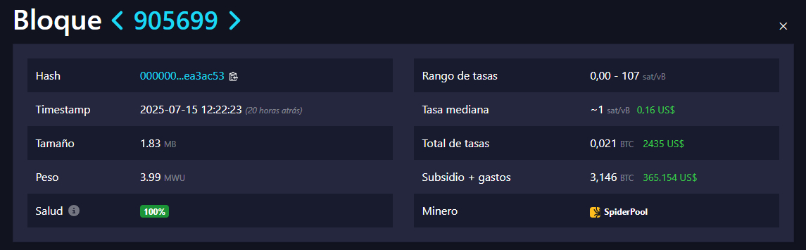 Datos del explorador de bloques señalan que a las 12:22 (horario de mempool.space) de ese día, SpiderPool minó el bloque 905699, como se ve en la siguiente imagen: