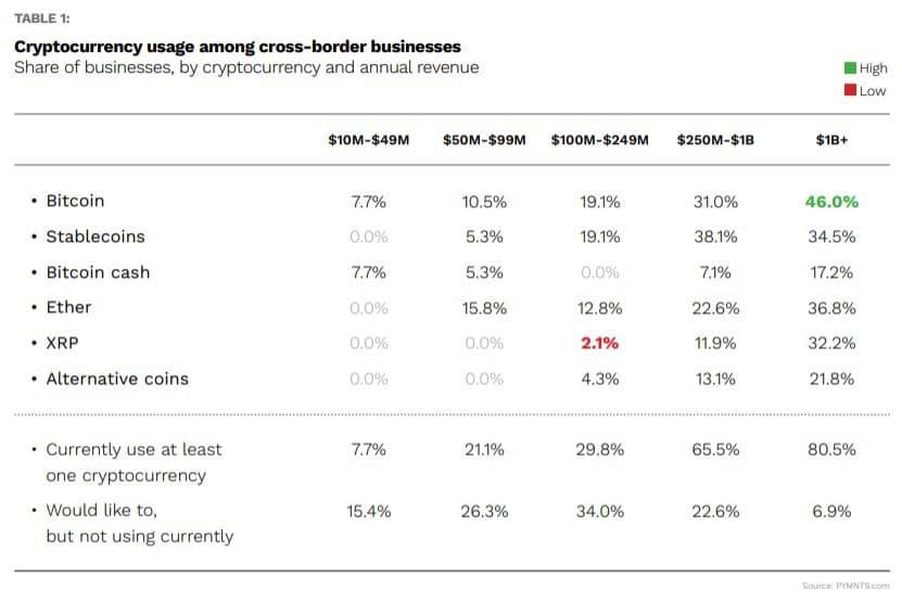 Con respecto a esta adopción, una encuesta reciente descubrió que el 58% de las compañías multinacionales ya utiliza las criptomonedas para enviar pagos al exterior. Es decir, 6 de cada 10 empresas las usan. Entre ellas, bitcoin (BTC) es la más escogida —sobre todo entre aquellas con mayores ganancias anuales—, pero también aparecen las criptomonedas estables entre las favoritas.