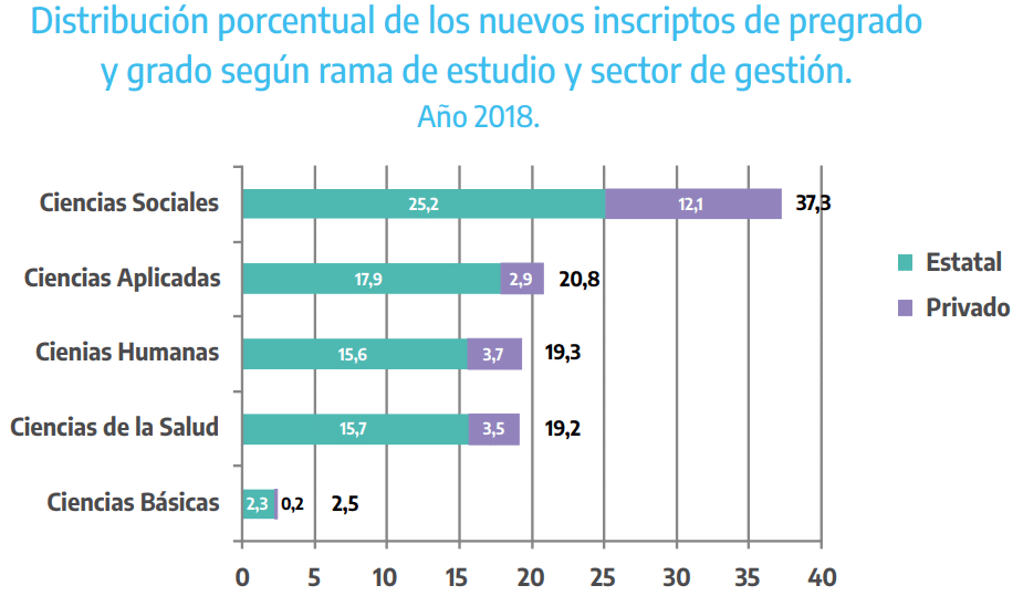 Efectivamente, el más reciente informe oficial de estadísticas universitarias en Argentina, que data del año 2018, confirma esta afirmación. Se observa allí que el 20,8% de los nuevos inscriptos a carreras universitarias, optó por formarse en ciencias aplicadas, donde se incluyen las nuevas tecnologías.
