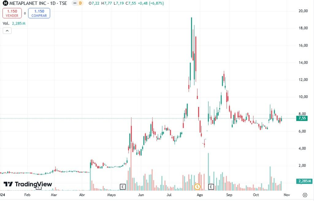 Tras esta รบltima compra de bitcoin, las acciones de Metaplanet aumentaron, subiendo desde los 6,84 dรณlares a 7,77 dรณlares, un incremento del 13,6%, y se mantuvieron sobre los 7,53 dรณlares al cierre de este reporte, de acuerdo con los datos de TradingView.