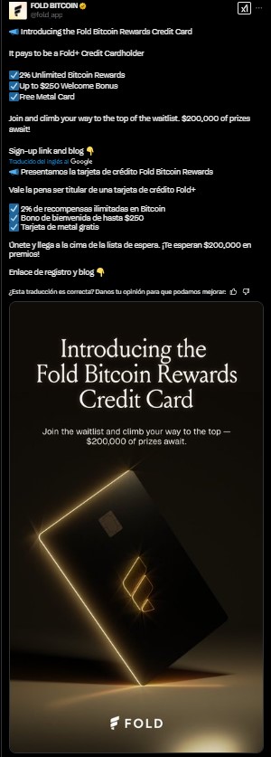 La tarjeta de crédito en bitcoin ofrece a los usuarios hasta un 2% de recompensas ilimitadas en bitcoin y bonificaciones de hasta 250 dólares, según el comunicado publicado por Fold.