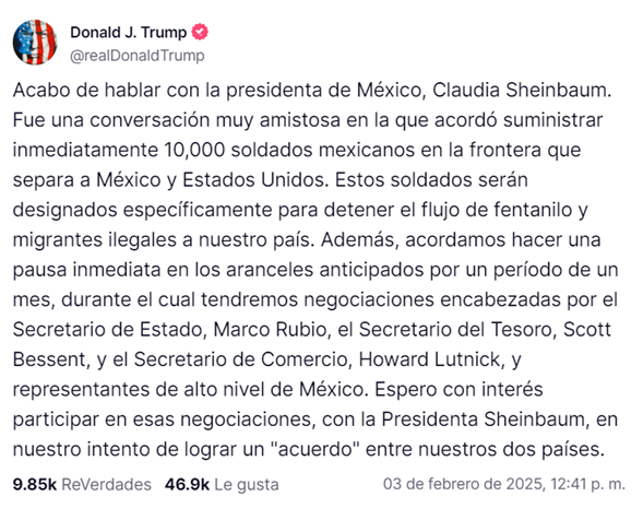 Sin embargo, como si la administración de Trump hubiese querido parar el miedo y repudio que desató el aumento de aranceles y deportaciones, el presidente retrocedió en su jugada. “Acabo de hablar con la presidenta de México, Claudia Sheinbaum”, reveló mediante una publicación en su red social, Truth Social.