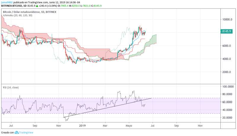 La ruptura en la lรญnea de tendencia del รญndice de fuerza relativa (RSI) (en el grรกfico inferior) marca el fin de un movimiento alcista. Como se plantea en la grรกfica, el RSI viene presentando mรญnimos mรกs altos desde diciembre del 2018, no obstante, el 31 de mayo la lรญnea de tendencia fue rota dando paso a una correcciรณn en el indicador. Aunque ha retrocedido a niveles mรญnimos en semanas, este todavรญa se encuentra en territorio alcista (encima del punto 50) asรญ que el impulso sigue siendo optimista.