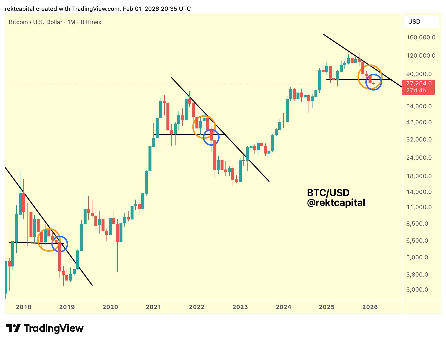 El analista técnico conocido como Rekt Capital, especializado en ciclos de bitcoin, distingue que la moneda digital cerró enero de 2026 por debajo de la base del triángulo macro. Es decir, rompió a la baja la base de soporte que hizo en los 82.500 dólares antes conseguir su récord histórico.