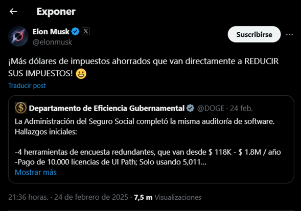 Musk está a cargo del Departamento de Eficiencia Gubernamental (DOGE, por su sigla en inglés), un organismo creado por Trump para eliminar el gasto público considerado “innecesario”. Desde esta posición, el ahora funcionario no para de alardear los incesables recortes que hacen desde este ente que permitirán reducir los impuestos, ante un Estado que no requiera tanta recaudación fiscal.