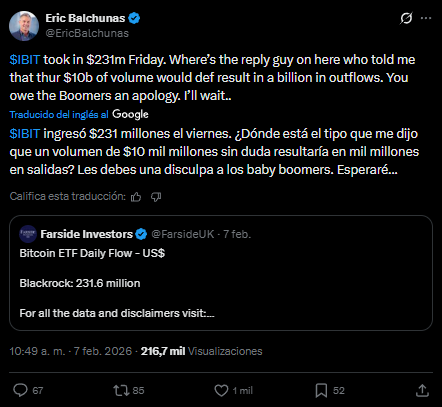 Recientes datos de flujos en ETF de BTC refuerzan esta tesis. En febrero de 2026, los ETF spot de Bitcoin han visto salidas netas de USD 272 millones en una sesiรณn, con AUM totales cayendo por debajo de USD 100 billones a USD 97 billones. Sin embargo, IBIT ha mostrado resiliencia, con ingresos de USD 231 millones el 6 de febrero, pese a la volatilidad. Analistas como Eric Balchunas de Bloomberg han destacado cรณmo estos flujos contradicen predicciones de salidas masivas, atribuyรฉndole a inversores tradicionales (ยซboomersยป) que mantienen posiciones.