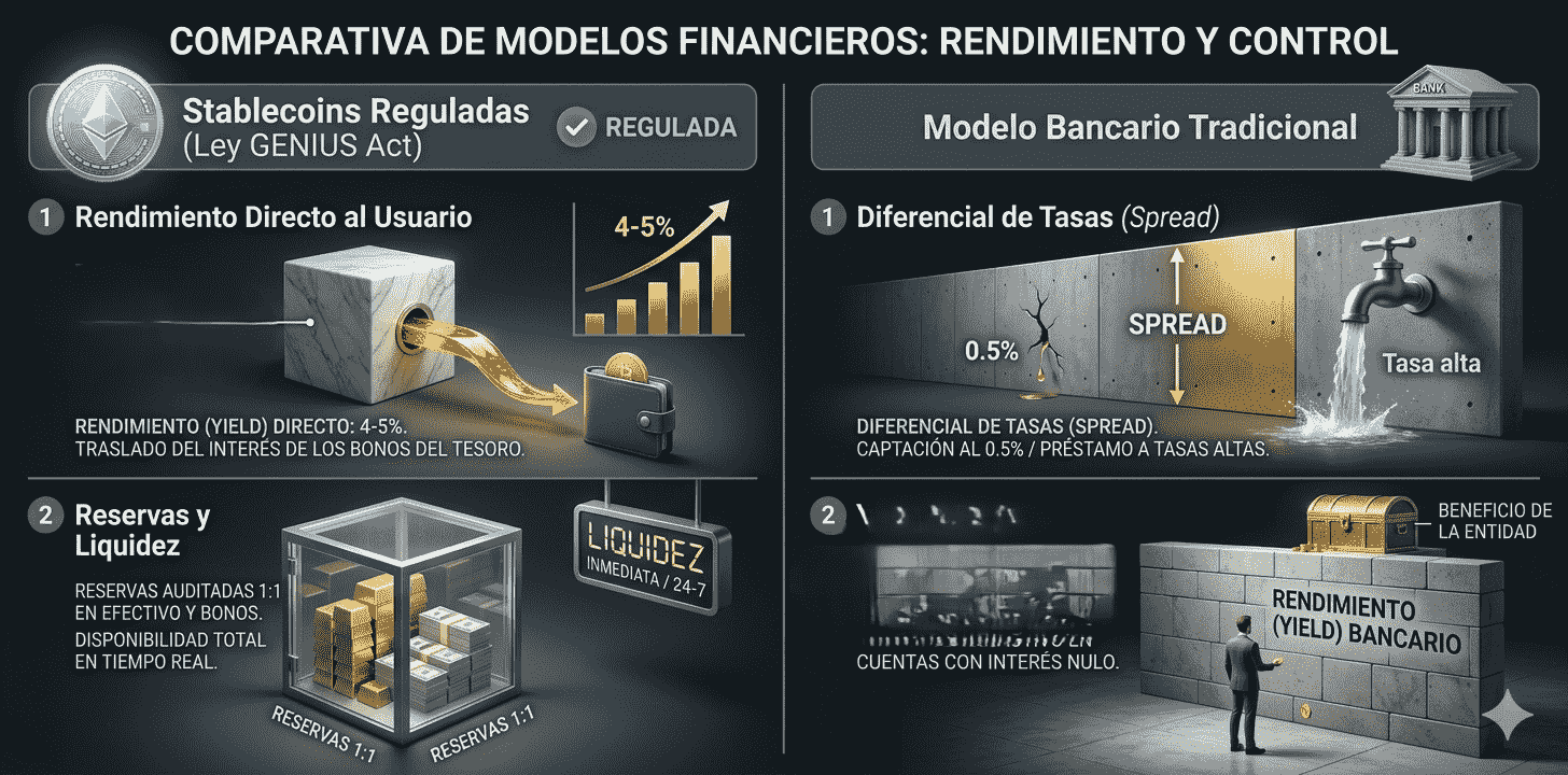 El esquema bancario actual sobrevive gracias a la trampa del margen o spread. Funciona al captar depรณsitos con intereses cercanos al 0,5% para prestarlos a tasas muy superiores. En tรฉrminos simples: es el margen de ganancia bruta que obtiene el banco por su actividad principal de intermediaciรณn financiera (captar dinero barato y prestarlo caro). Representa el beneficio que cubre costos operativos, riesgos, provisiones y genera utilidad neta. Frente a esto, una stablecoin regulada que traslade el rendimiento de los bonos del Tesoro (4% o 5%) destruirรญa este monopolio del ahorro privado en cuestiรณn de meses.