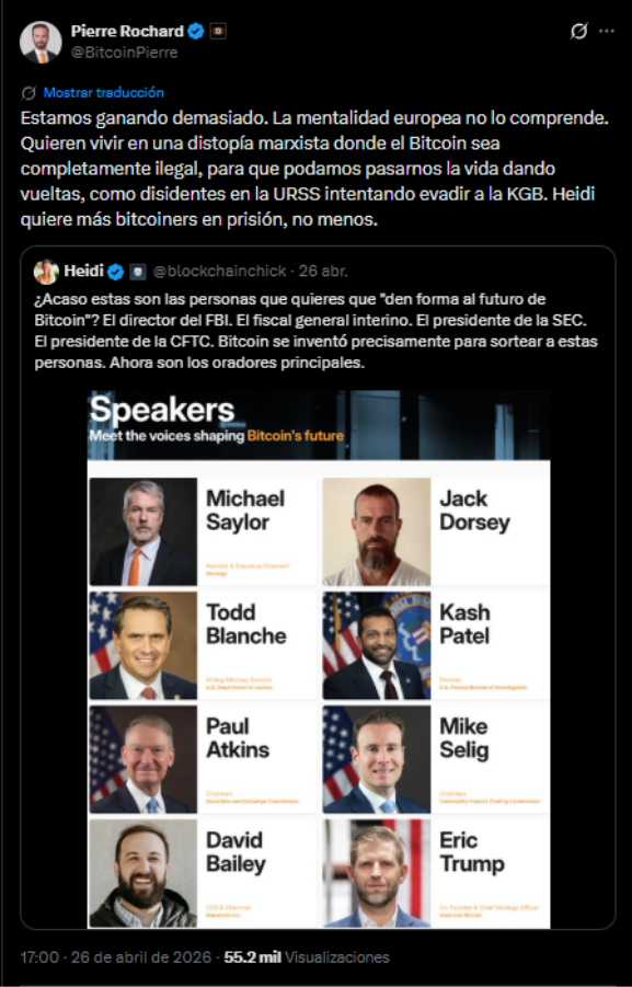 Si alguien se preguntaba qué cara tendría el panóptico financiero del siglo XXI, en la lista de speakers de Bitcoin 2026 tiene la respuesta: el director del FBI, el fiscal general en funciones, los presidentes de la SEC y de la CFTC subidos al escenario de la que se vende como la mayor conferencia de Bitcoin del mundo. ¿Son estas las voces que queremos que den forma al futuro de Bitcoin? Y, defendiendo esa cartelera en X, voces que acusan a los bitcoiners europeos de buscar una distopía marxista.