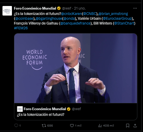 En 2026, el WEF elevó los criptoactivos a la programación central de manera más explícita que nunca. Larry Fink, CEO de BlackRock, urgió en un panel a “movernos más rápidamente con la tokenización en una blockchain común”. Esto para reducir costos, fricciones transfronterizas y corrupción.