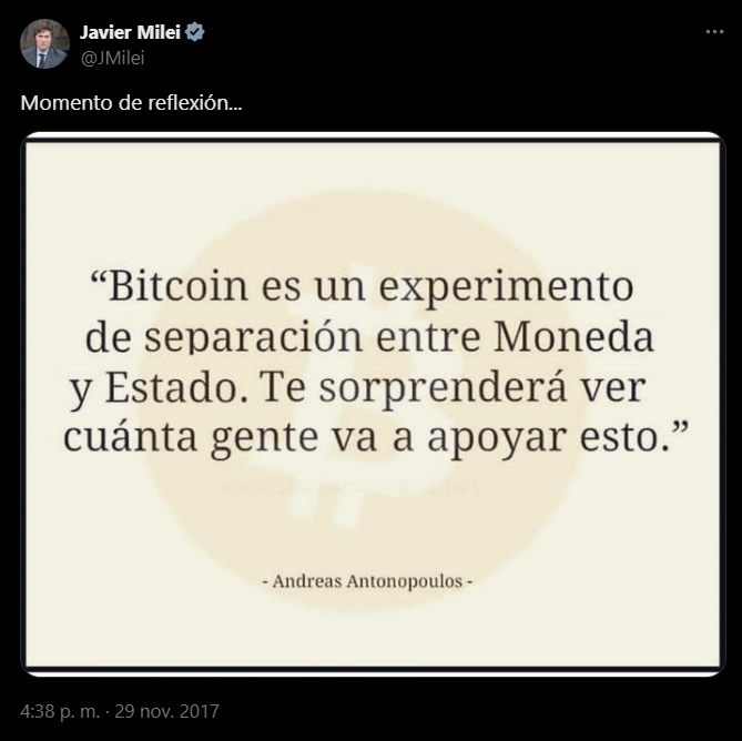 A inicios del año pasado, dijo que «bitcoin es la reacción natural frente a la estafa de los bancos centrales y que el dinero vuelva al sector privado». Incluso, tiempo antes, por el año 2017, compartió vía Twitter una frase de Andreas Antonopoulos, un entusiasta de la moneda, que decía: «Bitcoin es un experimento de separación entre la moneda y el Estado. Te sorprenderá ver cuánta gente va a apoyar esto».