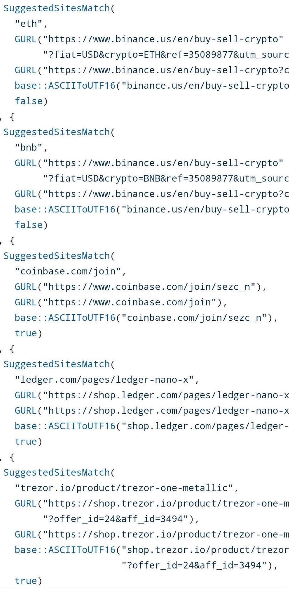Pero Eich omitió convenientemente que ese “error” asociado a Binance, en realidad incluye otros sitios que forman parte del entorno de las criptomonedas. Particularmente, usuarios han presentado pruebas de la existencia de enlaces de referidos para los sitios de la casa de cambio Coinbase, además de los proveedores de monederos fríos Trezor y Ledger.