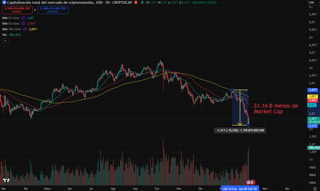 Esta tesis resulta seductora y peligrosa a la vez, especialmente tras observar la violencia tรฉcnica de las รบltimas semanas, donde el mercado de criptomonedas ha perdido aproximadamente 1.16 billones de dรณlares en capitalizaciรณn de mercado desde el pasado 14 de enero.