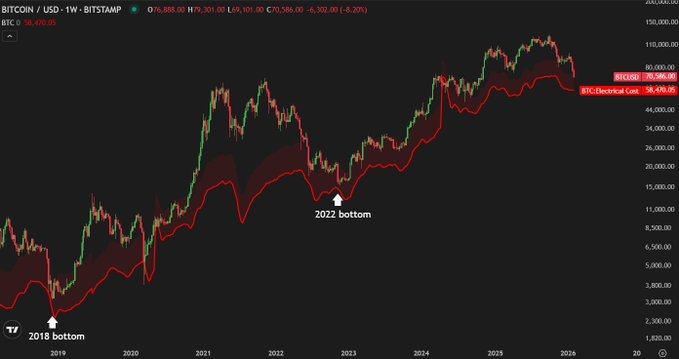 Un factor determinante que sostiene la estructura actual es el costo de producciรณn real. Histรณricamente, el precio de Bitcoin ha demostrado una incapacidad casi total para permanecer por debajo de su costo elรฉctrico de forma sostenida.