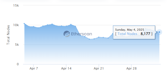 Al 4 de mayo, Ethereum mantiene un caudal de nodos que apenas supera los 8.000 en todo el planeta, de acuerdo con etherscan: