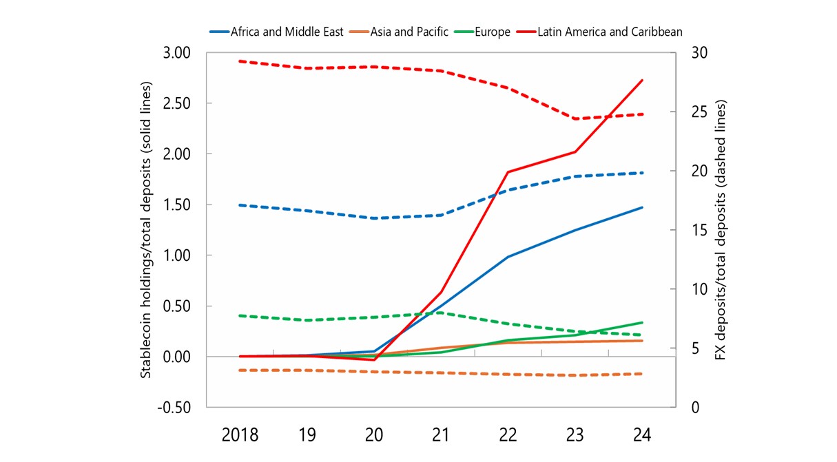 Según el FMI, las tenencias de stablecoins en distintas regiones del mundo siguen siendo pequeñas comparadas con los depósitos bancarios en moneda extranjera.