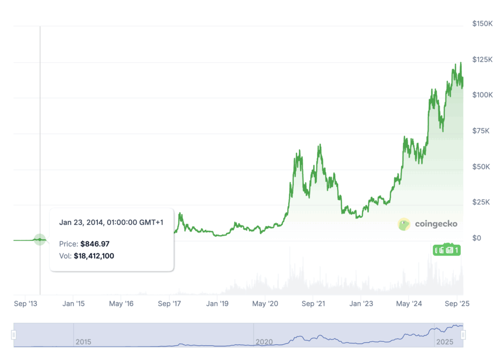 Once aรฑos despuรฉs, bitcoin ha demostrado ser uno de los mejores depรณsitos de valor de la historia precisamente por no ser emitido por ningรบn gobierno. Desde enero de 2014, el suministro del dรณlar ha crecido en un 98%, con 11.095,9 mil millones de dรณlares agregados al M2. La inflaciรณn acumulada en EE. UU. desde esa misma fecha hasta noviembre 2025 es de entre 35 y 40%. En este perรญodo, el dรณlar se ha depreciado alrededor de un factor de ~142,6 veces respecto a bitcoin.ย