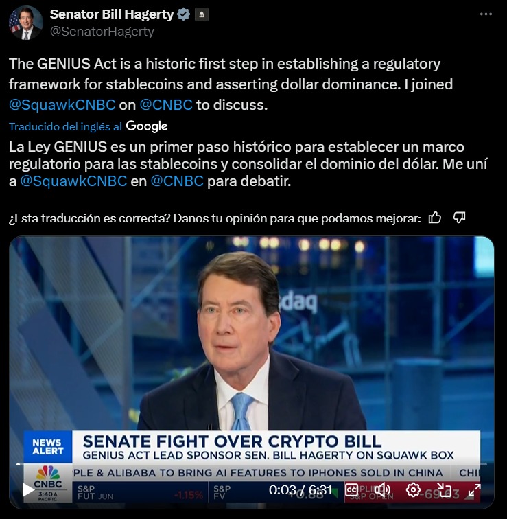 La Ley GENIUS aún espera una votación final en el Senado, necesitando una mayoría simple para avanzar. Si se aprueba, deberá coordinarse con una ley similar en la Cámara de Representantes. Si ambas cámaras aprueban versiones distintas, un grupo de senadores y representantes negociará un texto unificado, que luego requerirá la firma del presidente Donald Trump.