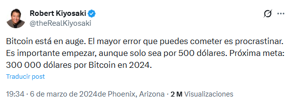 Kiyosaki podría basarse en análisis técnico, análisis fundamental, algún modelo predictivo como el Stock-to-Flow, o la Power Law… pero no. Él simplemente escribe números en su cuenta de X como si eso fuera una suficiente fundamentación.