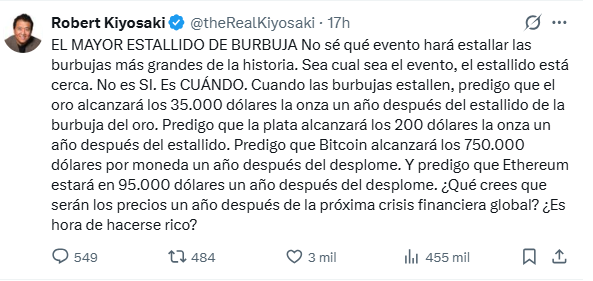 Robert Kiyosaki volvió a hacer lo que mejor sabe: publicar un tuit apocalíptico con números enormes, plazos indefinidos y una pregunta final que suena a invitación a hacerse rico.