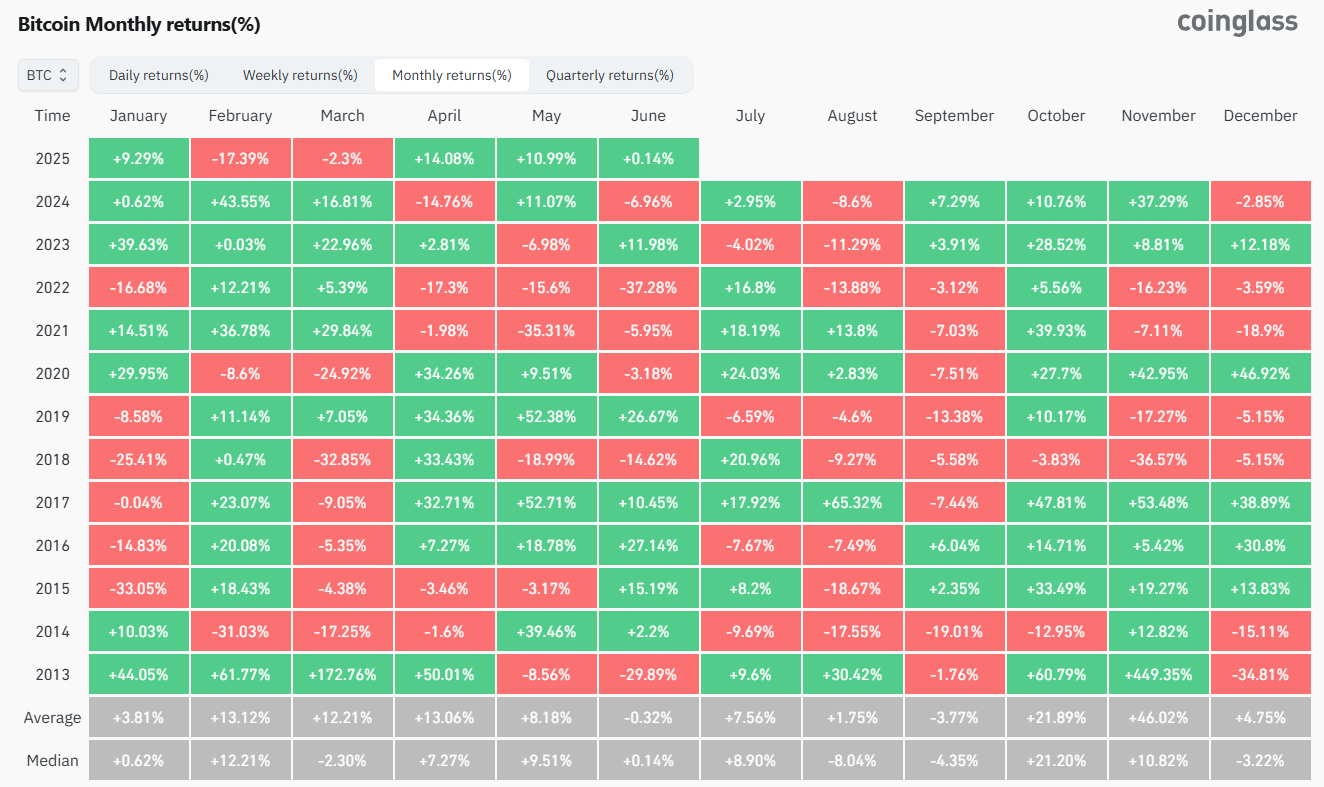 Según la historia, junio es un mes «neutral» para bitcoin. Desde 2013, ha habido seis junios que terminaron con retornos positivos y seis junios que terminaron con retornos negativos. Por lo tanto, la estadística no ayuda demasiado para hacer predicciones (a diferencia de lo que ocurre con meses como febrero u octubre).