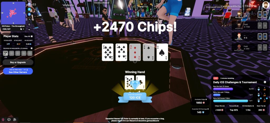 Si bien los resultados son anecdóticos en este caso, hay un hecho que no se puede obviar, y es que los jugadores pueden hacer dinero real en estas mesas de póker. Esto gracias al token ICE, que se gana completando desafíos y se puede multiplicar según el nivel del NFT que se posee y a medida que se aumenta el percentil del jugador con buenos resultados. En mi caso, logré multiplicarlos por 1,1x. A esto se suma además los 3 puntos de experiencia (XP) que el juego otorga y se acumulan en el perfil de cada jugador.