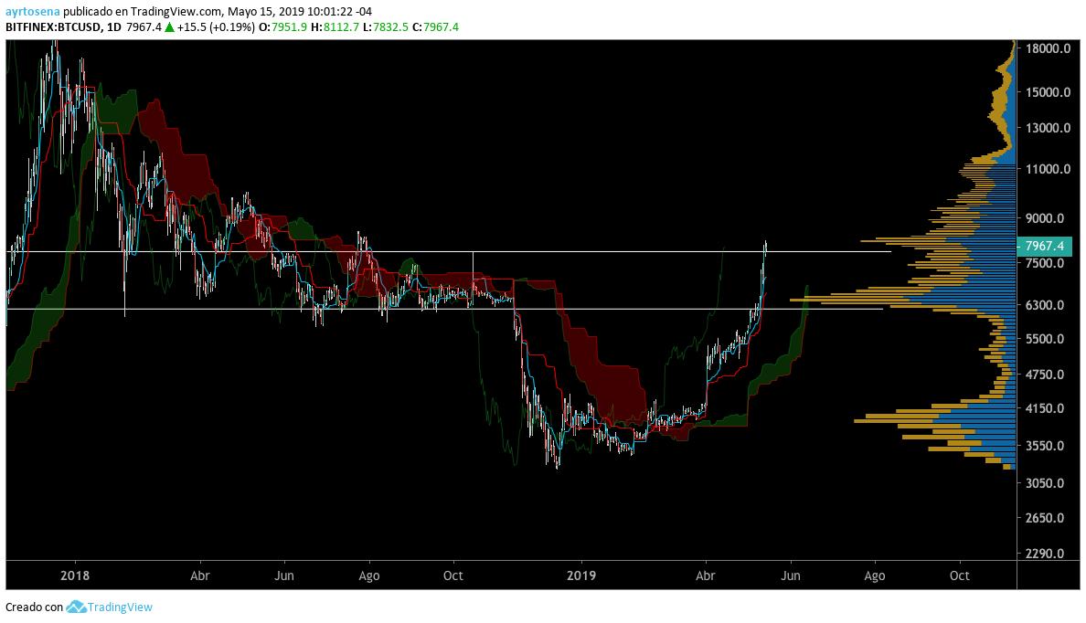 Desde entonces, el precio se ha desplazado hasta un área de resistencia marcada por una zona de congestión de volumen histórico que orbita los USD 7.800 y USD 8.000 (líneas a la derecha del gráfico) dejando muy por detrás a los promedios móviles de 50 y 200.