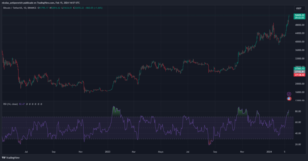 En el siguiente gráfico de TradingView puede apreciarse el acelerado movimiento que BTC ha tenido en el último mes (coincidente con la aprobación de los ETF de bitcoin al contado en Estados Unidos). Se aprecia también el indicador RSI al que se hará referencia más adelante: