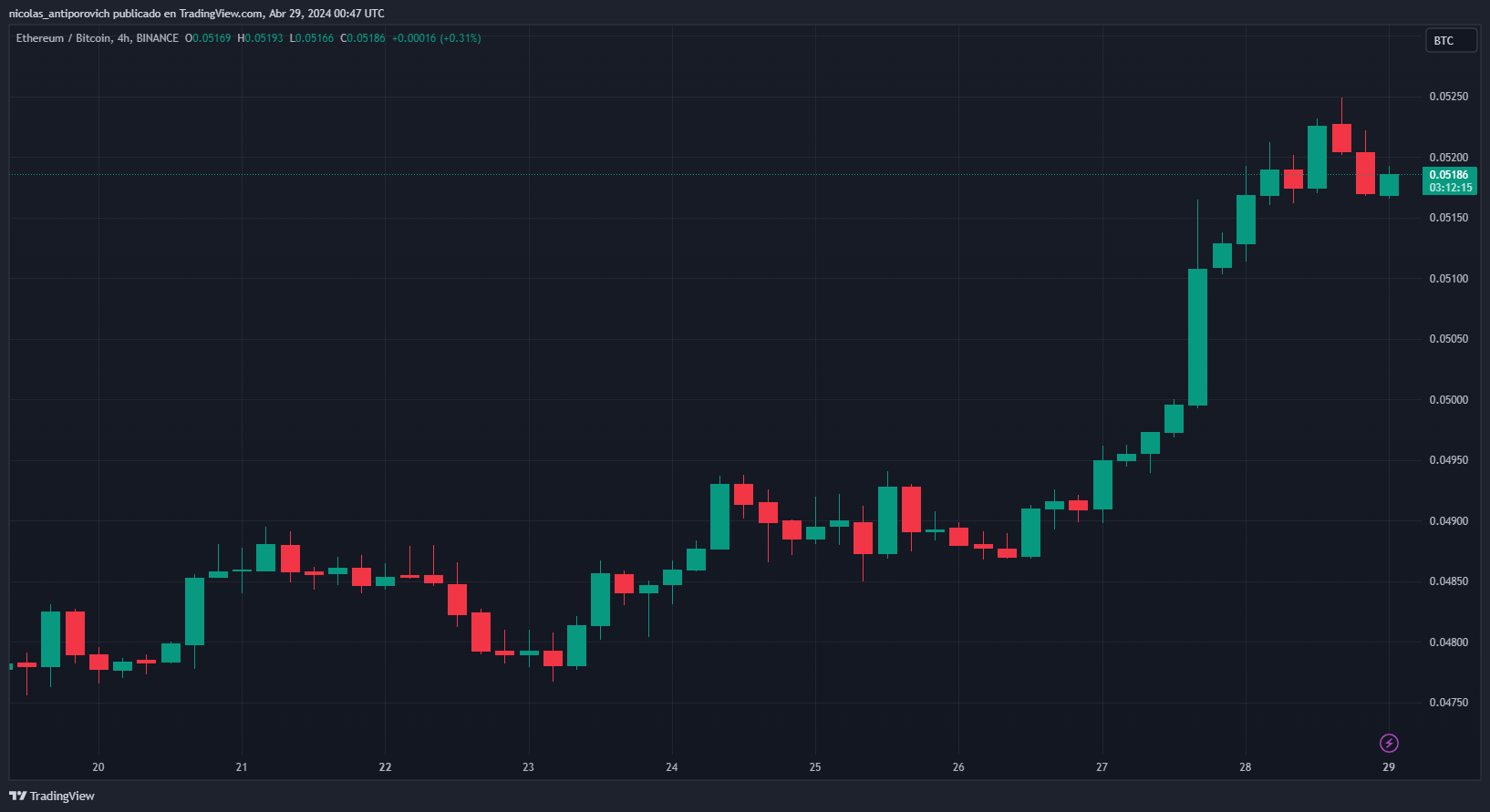 En el siguiente gráfico, proporcionado por TradingView, se observa el movimiento del par ETH-BTC durante la última semana. Cada vela roja o verde representa el movimiento que tuvo ETH-BTC en 4 horas:
