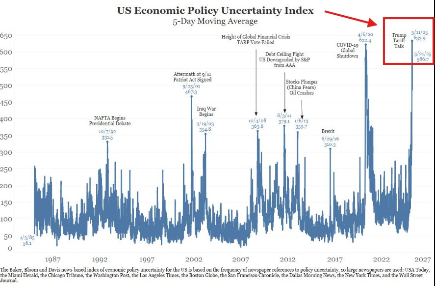 Y, para el equipo financiero liderado por el economista Adam Kobeissi, «la política económica se encuentra ahora en el momento más incierto de su historia reciente», tal como se observa en el siguiente gráfico, que muestra el índice de incertidumbre económica: