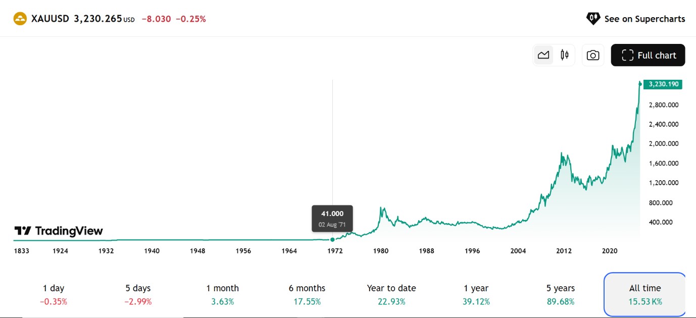 El dólar ha perdido 98% de su valor respecto al oro durante este tiempo. En 1971, 1 USD compraba ~0.0244 onzas de oro. En 2025, 1 USD compra ~0.00031 onzas de oro. Esto equivale a una devaluación de alrededor del 9.103,2%, reflejando el impacto del abandono del patrón oro, la inflación, la expansión monetaria y el aumento de la demanda de oro como activo refugio. Visto de esta manera, el dólar no parece muy estable.