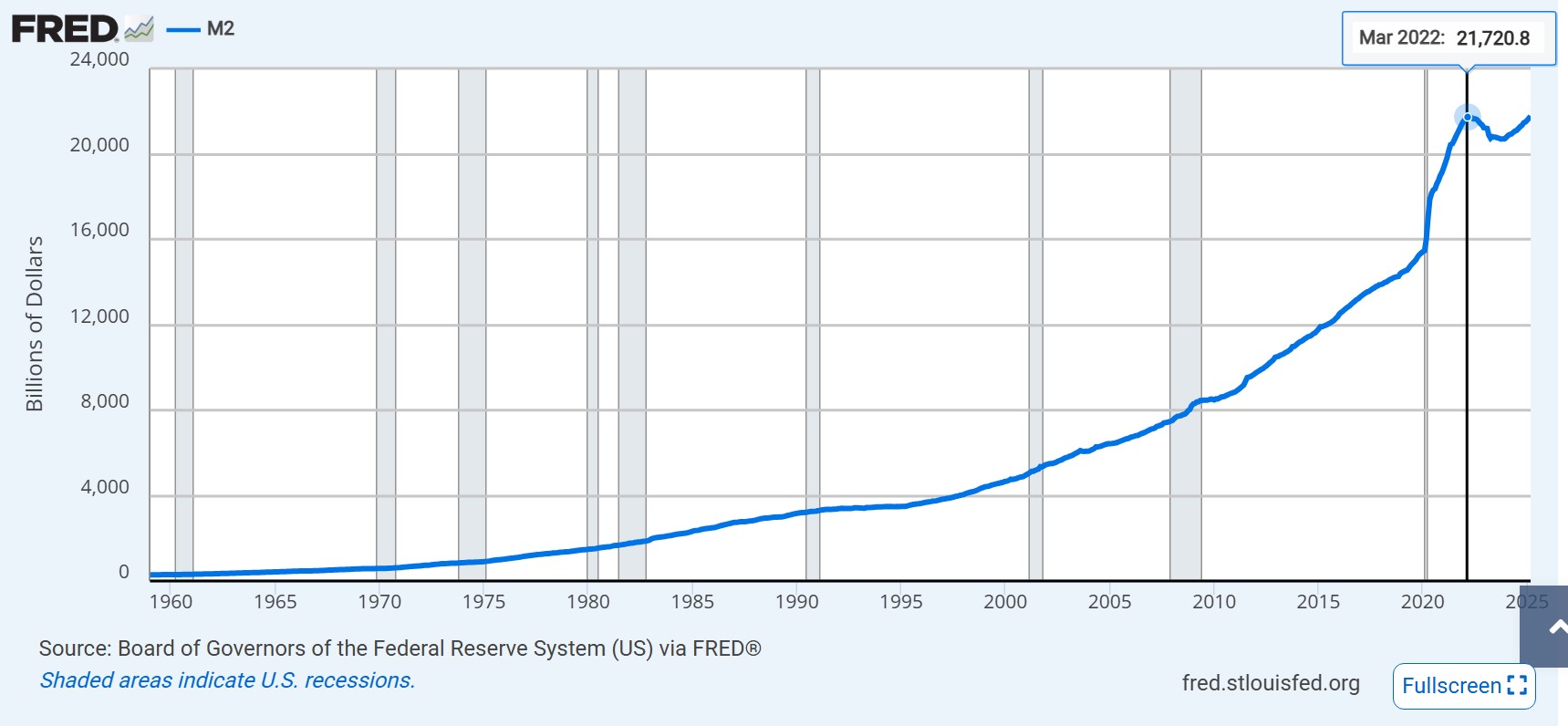 Entre 2020 y 2021, se emitieron aproximadamente USD 6.3 billones según la métrica M2, impulsado por los estímulos fiscales (cheques directos, transferencias) y monetarios (quantitative easing) implementados durante la pandemia de COVID-19. Para poner en perspectiva esta cifra, consideremos que, después del Nixon Shock (15 de agosto de 1971), tomó aproximadamente 35 años (hasta principios de 2007) para que la oferta monetaria M2 aumentara en USD 6.3 billones, pasando de USD 0.7103 billones en 1971 a USD 7.0103 billones.