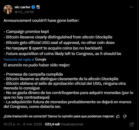 Este mismo hecho estรก relacionado con un tema que destaca Nic Carter, destacado analista y defensor de Bitcoin. Para รฉl, uno de los puntos mรกs destacados del anuncio es el reconocimiento oficial de Bitcoin por parte del gobierno de los Estados Unidos.