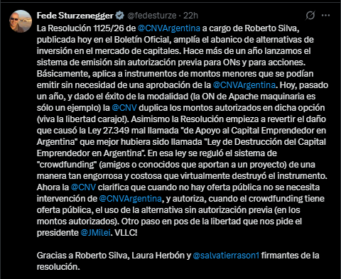 Bajo este nuevo esquema, las pequeรฑas empresas podrรกn captar capital de forma mรกs directa. El ministro de Desregulaciรณn y Transformaciรณn del Estado, Federico Sturzenegger, seรฑalรณ que la medida ยซamplรญa el abanico de alternativasยป, duplicando los montos habilitados respecto al aรฑo anterior para revertir el daรฑo de regulaciones previas que asfixiaron al capital emprendedor.
